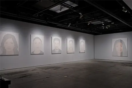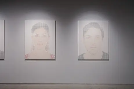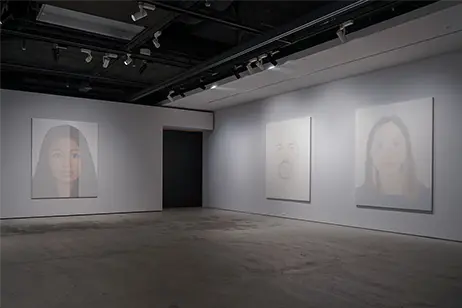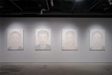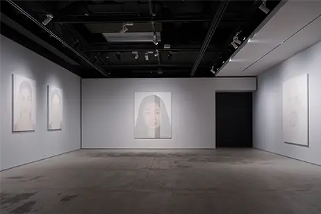 The newly produced portraits in this exhibition were created with the concept of “tie” in mind, and the images of the objects depicted in the portraits were changed. The motifs are selected from images obtained by using Google's image search form to translate the word “proof photo” into English, Chinese, Hindi, Spanish, French, and other languages that would be spoken in the world in 2023. The images are selected from the hits. By depicting an unknown person, the distance to the model was flattened between Saw Sowen and the viewer, and the question “Who are you? At the same time, in the search for images in each language, various images of exemplary figures, gender, lookism, etc., from the region where the language is used, intertwine and emerge. When we ask the question “Who are you?” of a stranger depicted in a work of art, we are at the same time illuminating the latent thoughts at the bottom of the viewer's own consciousness and asking ourselves “What exactly did you see? You will find yourself asking, “What exactly did you see? By following the small squares of colored surfaces one by one with our eyes, we can feel the contours of ourselves as we disassemble ourselves and regain our own bodies.