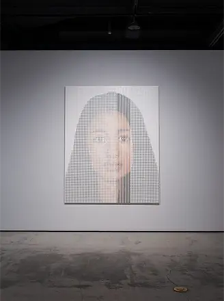 The “tie” series is a series of portraits on large canvases with pixelated color surfaces depicting proof photographs of close friends. The certificate photo, which requires the viewer to maintain a neutral expression so as not to express any particular emotion, is used to manage the individual in a social space. By adopting certificate photographs as a motif, issues such as the management of individuals in modern society, or the relationship between surveillance systems and power, will emerge outside of the individual portraits. At the same time, the small 30 x 40 mm photographs, which record an unknown side of close friends with whom we usually have pleasant conversations, will raise questions such as “Who are you? Where does your identity come from? and “Where does your identity come from? The mysterious expressions unconsciously created by close friends are broken down into numerous cells and reconstructed with pixelated color surfaces, as if to confirm their contours one by one, gently caressing them, as if to ask the question, “Who is the you that I am supposed to know? The face is transformed into a boundary between private and public space by reconstructing it with pixelated color surfaces, as if gently caressing its outline, as if checking its many cells. Of course, even if the model depicted in “tie” is an acquaintance or friend of Saw Sowen, she is still a distant stranger to us, the viewers. When we are confronted with an unknown person, what we see is an image selfishly interpreted by our subconscious mind and thoughts. There is a certain potential to violently create an image.